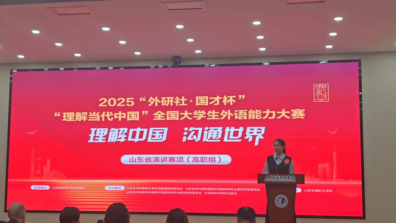 本站讯 近日,2025年“外研社·国才杯”“理解当代中国”全国大学生外语能力演讲大赛山东省赛区决赛(高职组)在潍坊举行,大赛吸引了全省79所高职院校145位选手参赛,共有87名选手通过前期选拔进入本次决赛。大赛汇集了各个院校的优秀选手,竞争异常激烈,来自我校文化旅游学院应用英语专业的学生张亚拿,从众多选手中脱颖而出,最终斩获金奖。