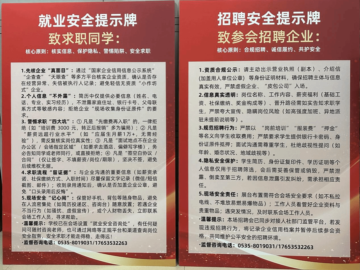 为帮助毕业生“安全求职、高效求职”,本次招聘会提前对所有参会企业进行了严格的资质审核——核查营业执照、招聘人员身份等信息,现场签订《用人单位诚信招聘承诺书》,要求企业按照《就业服务与就业管理规定》(劳动保障部第28号令)有关规定进行招聘,保证岗位真实性,杜绝虚假招聘、违规收费等行为。还在会场设置了就业安全提示牌、招聘安全提示牌,以及“就业安全咨询处”,由老师现场指导讲解求职陷阱防范知识,强化学生的安全求职意识。