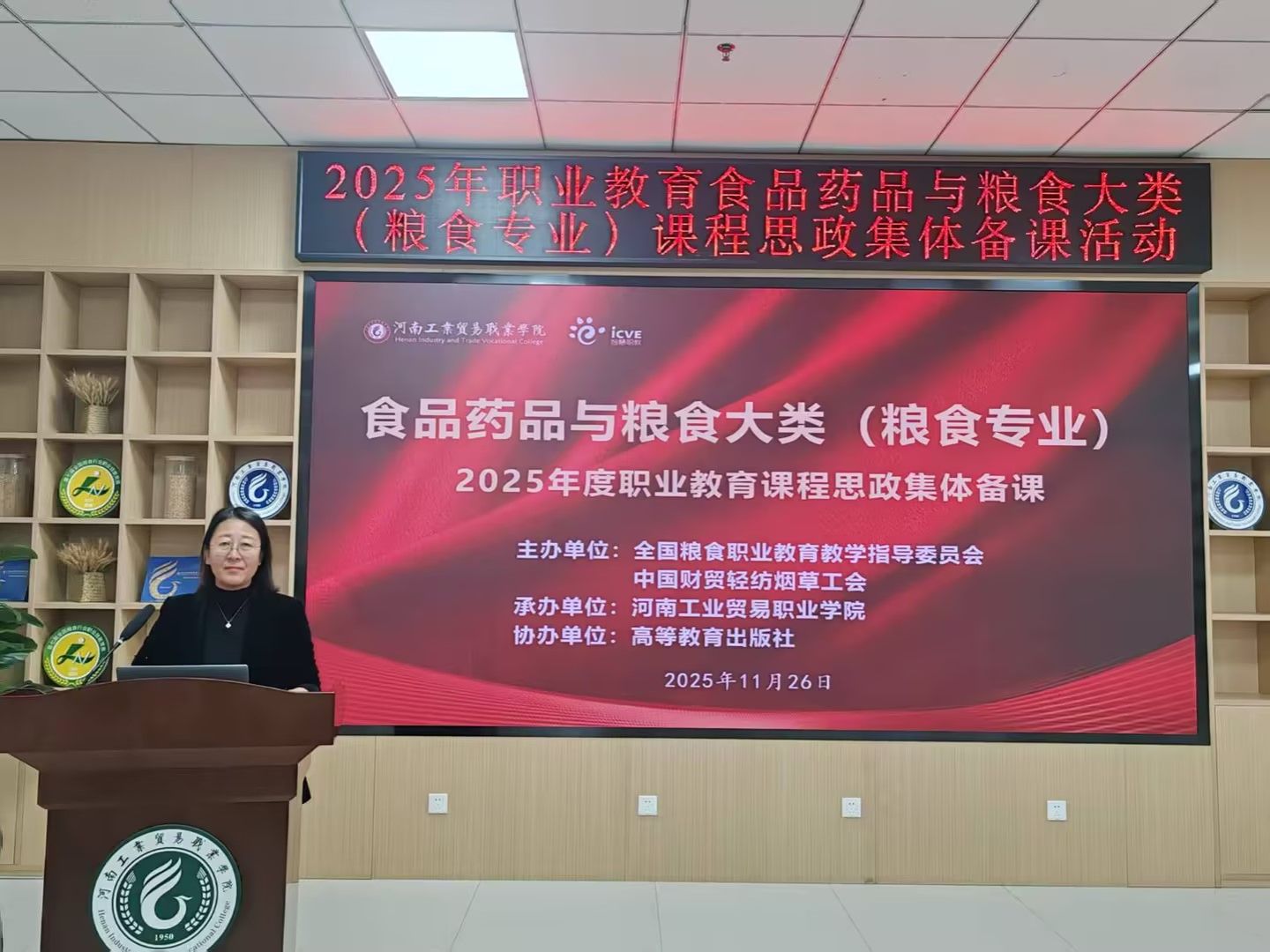 本站讯 11月26日,由全国粮食职业教育教学指导委员会与中国财贸轻纺烟草工会联合主办的2025年职业教育食品药品与粮食大类(粮食专业)课程思政集体备课活动在河南工业贸易职业学院隆重举行。活动中,我校粮油食品学院院长黎海红教授应邀作国家级课程思政示范课程“粮油食品加工技术”的说课展示,系统呈现了课程在思政目标定位、教学内容重构与教学方法创新等方面的改革实践,彰显了我校“粮食特色+思政赋能”育人模式的扎实成效与创新突破,获得与会专家的广泛认可。