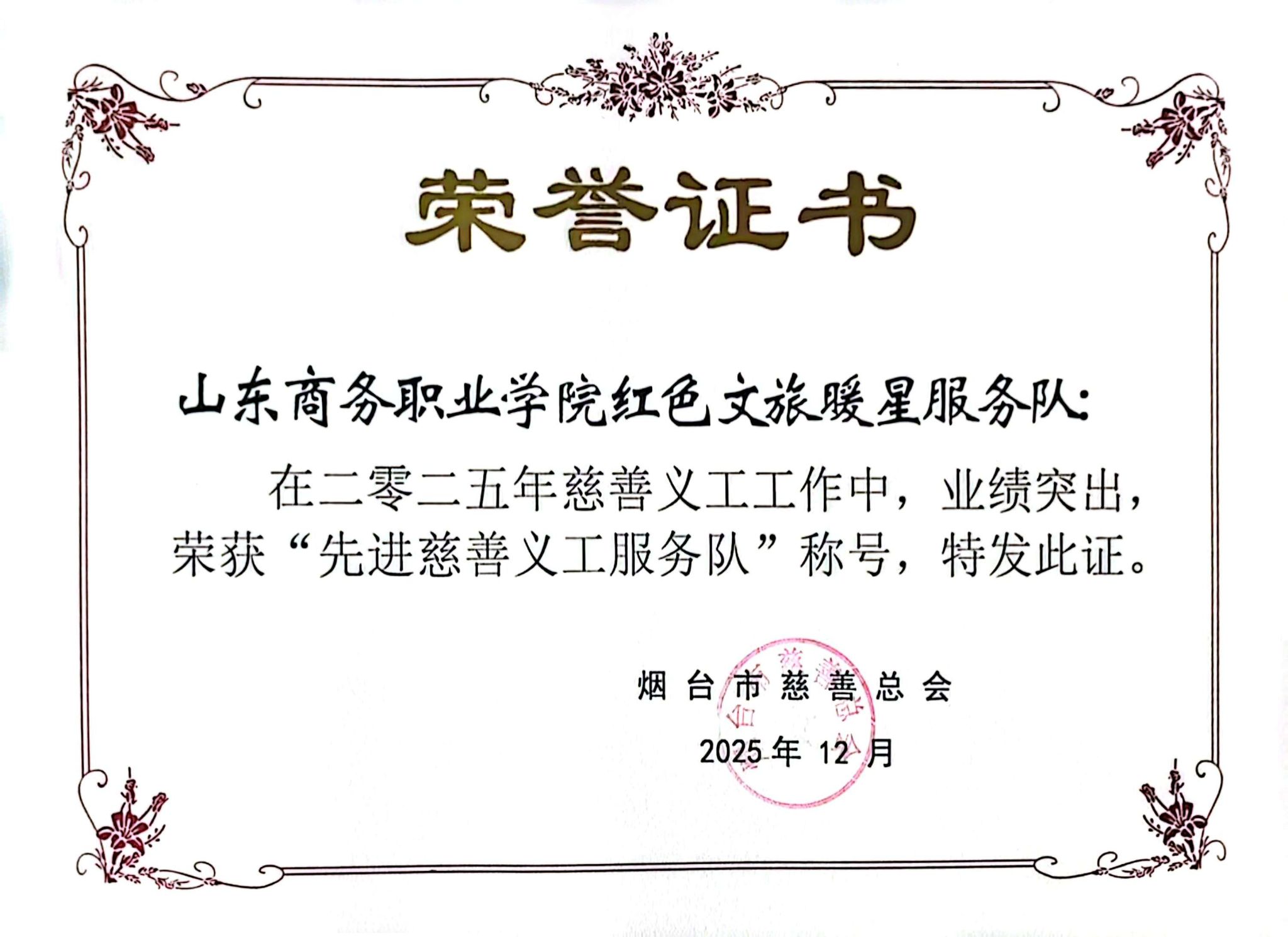 本站讯 12月22日,我校红色文旅暖星服务队在2025年度慈善义工工作中成效显著,被烟台市慈善总会授予“先进慈善义工服务队”荣誉称号。