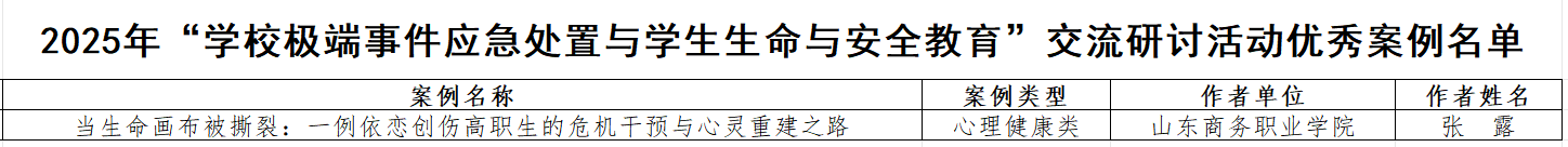 本次入选心理健康案例《当生命画布被撕裂:一例依恋创伤高职生的危机干预与心灵重建之路》针对一名受依恋创伤影响的高职生,构建“48小时急性应激响应+三阶段心理成长”全周期干预模式:以自由情绪涂鸦、安全岛数字绘画等艺术疗愈方法快速阻断自伤危机,通过“破碎自我”重构、家庭关系动态绘画修复原生创伤,结合思政引领实现从“危机解除”到“成长赋能”的转变,将创伤转化为专业创作动力。以工作实践为依托,主题鲜明、逻辑清晰,既体现了对学生生命安全的高度重视,又展现了我校在心理工作中的创新思路与务实方法,其经验做法具有较强的推广价值,得到了省级评审专家的一致认可。