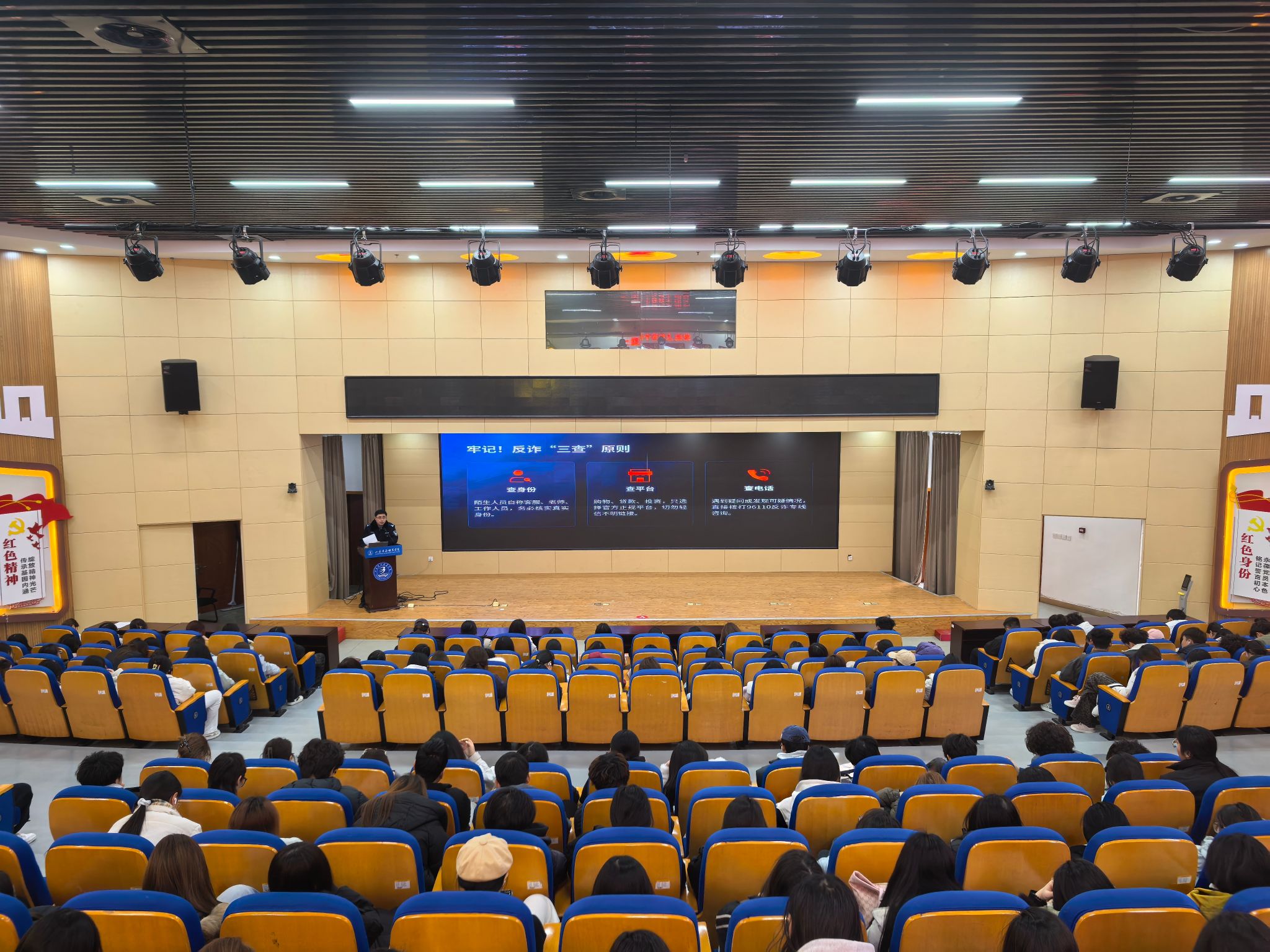 讲座现场,公安民警采取“案例剖析+现场讲解”的方式,聚焦当前学生群体高发的诈骗类型,结合发生在校园及周边的真实案例,深入剖析“网络刷单返利”“游戏账号交易诈骗”“冒充客服退款”等常见骗局的套路特点与作案手法。民警用通俗易懂的语言还原诈骗话术,提醒同学们牢记“不轻信、不透露、不转账”的“三不”原则,切实提高警惕,增强辨别能力。