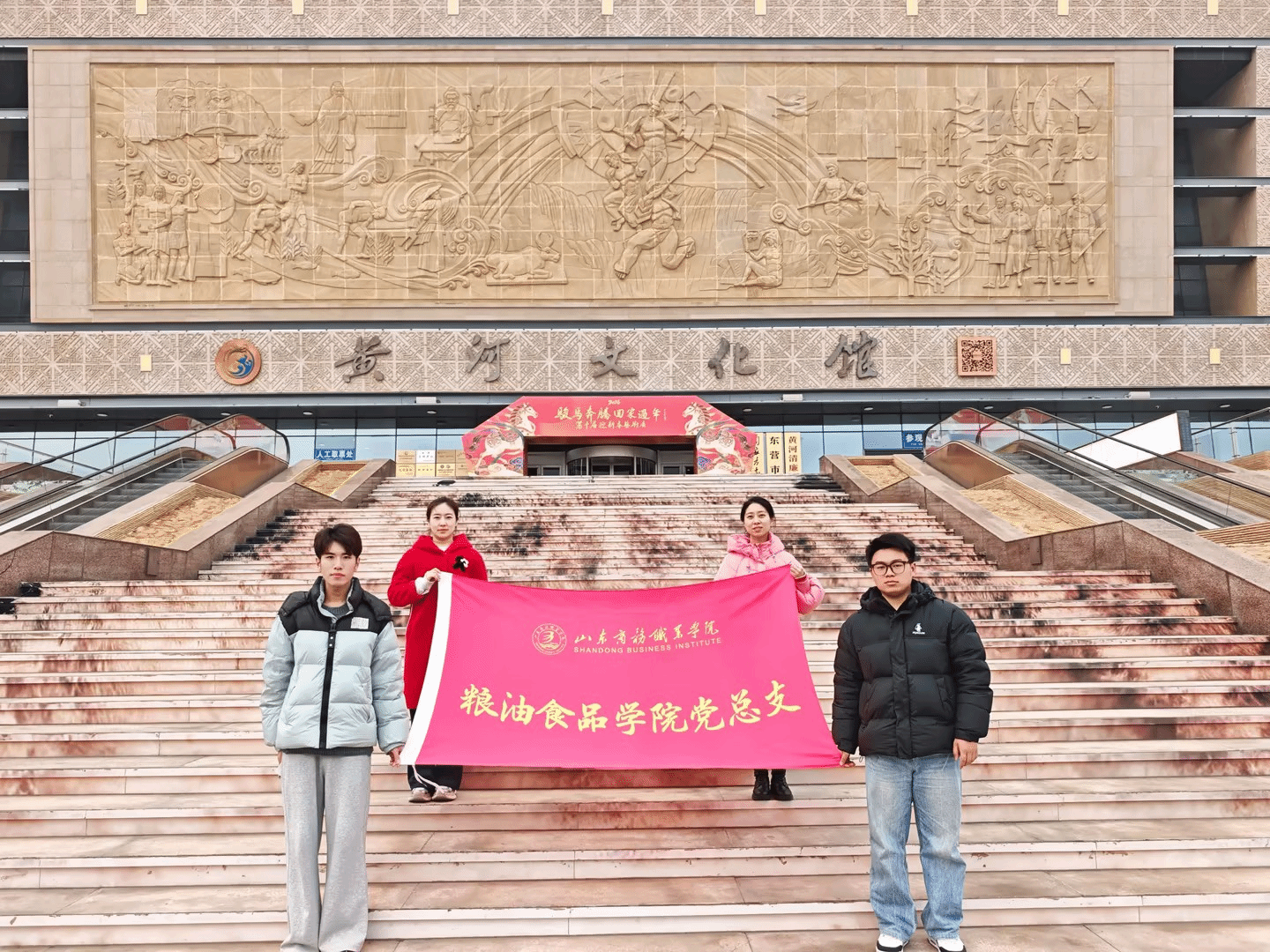 本站讯 近日,我校粮油食品学院“粮安智学”团队一行走进东营市,依托黄河文化馆“大河奔流·红色血脉”黄河流域红色文化主题展,开展了一堂“行走的思政课”。通过实地教学,团队成员在九曲黄河的壮阔史诗中感悟革命精神,在时代使命的召唤下凝聚维护国家粮食安全的青春力量。