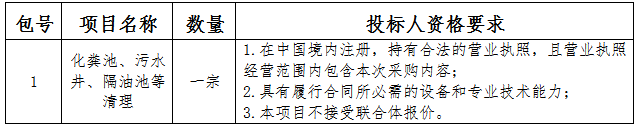 采购内容:化粪池、污水井、隔油池等清理;本项目划分一个包;
