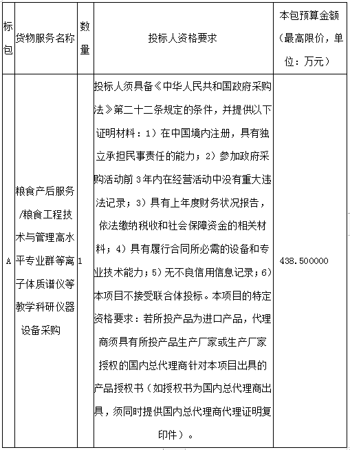 二、采购项目名称:粮食产后服务/粮食工程技术与管理高水平专业群等离子体质普仪等教学科研仪器设备采购