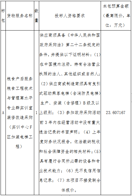 二、采购项目名称:粮食产后服务/粮食工程技术与高水平专业群实训室装修改造采购(实训中心F区加装电梯工程)