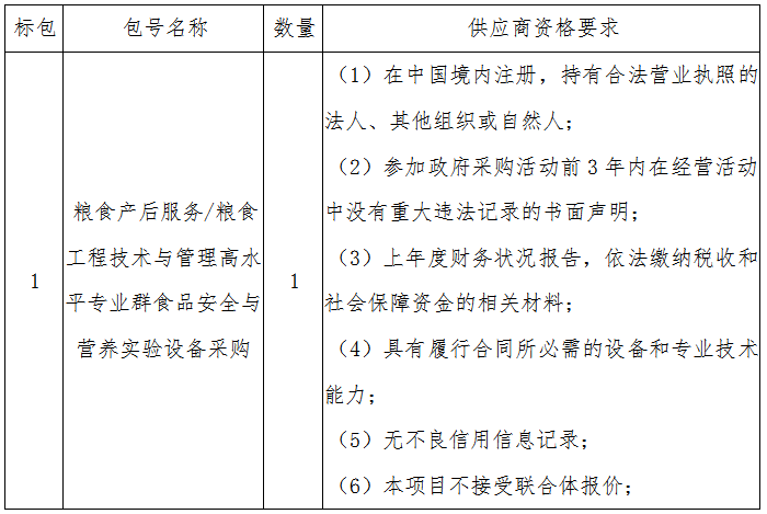 二、采购项目名称:粮食产后服务/粮食工程技术与管理高水平专业群食品安全与营养实验设备采购