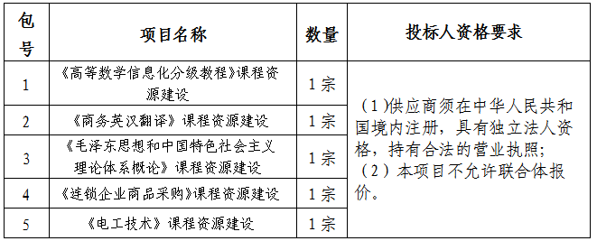 采购内容:《高等数学信息化分级教程》课程资源、《商务英汉翻译》课程资源、《毛泽东思想和中国特色社会主义理论体系概论》课程资源、《连锁企业商品采购》课程资源、《电工技术》课程资源建设;本项目划分5个包。