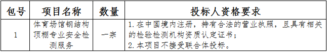 采购内容:体育场馆钢结构顶棚专业安全检测服务;本项目划分一个包;