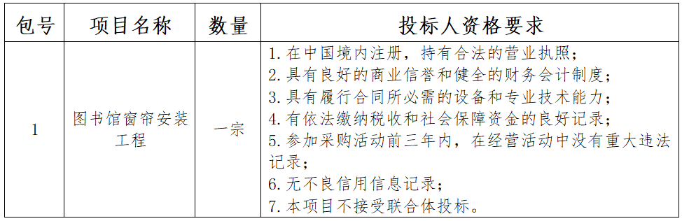 采购内容:图书馆窗帘安装工程;本项目划分一个包;