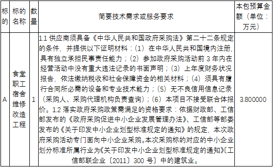 2.落实政府采购政策需满足的资格要求:依据财政部、工信部发布的《政府采购促进中小企业发展管理办法》、工信部等部委发布的《关于印发中小企业划型标准规定的通知》的规定,本次政府采购活动专门面向中小企业采购。本次采购标的对应的中小企业划分标准所属行业为《关于印发中小企业划型标准规定的通知》〔工信部联企业〔2011〕300号〕中的建筑业。