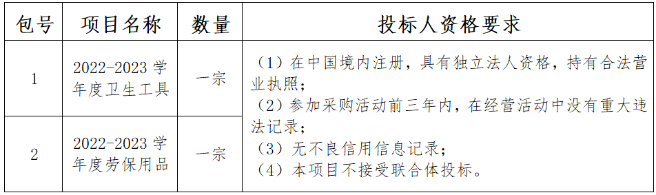 采购内容:2022-2023学年度卫生工具、劳保用品;本项目划分两个包;