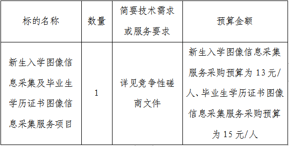 新生入学图像信息采集服务采购预算为13元/人、毕业生学历证书图像信息采集服务采购预算为15元/人。
