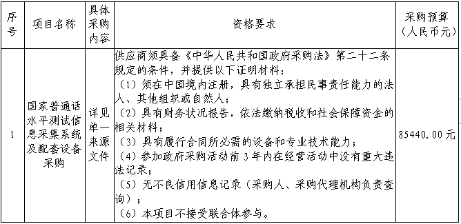 四、采购项目分包情况:国家普通话水平测试信息采集系统及配套设备的供货、安装调试及售后等相关服务;供货安装期:自接到采购人通知后7日历日内供货安装调试完毕;本项目划分为1个包。