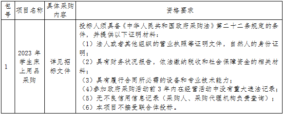 五、采购内容及包号情况:山东商务职业学院2023年学生床上用品的生产、供货、配送及售后等相关服务,本项目分为一个包。交付时间:2023年9月5号或6号供货,具体时间以学校通知为准。