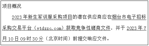采购需求:2023年新生军训服采购项目,共分为一个采购包。根据今年招生计划和往年实际需求情况进行采购。新生入校后自愿购买,具体采购数额以实际购买数量为准。此次2023年新生军训服采购项目,共选定2家供应商,供货比例各占50%。