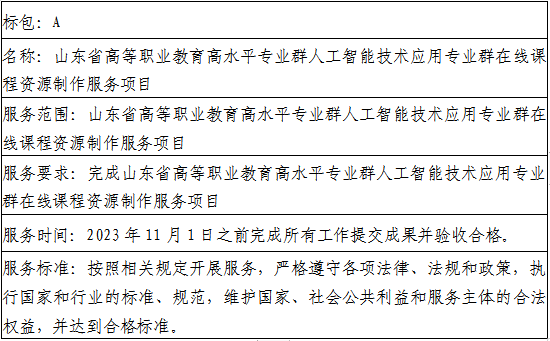 二、项目名称:山东省高等职业教育高水平专业群人工智能技术应用专业群在线课程资源制作服务项目