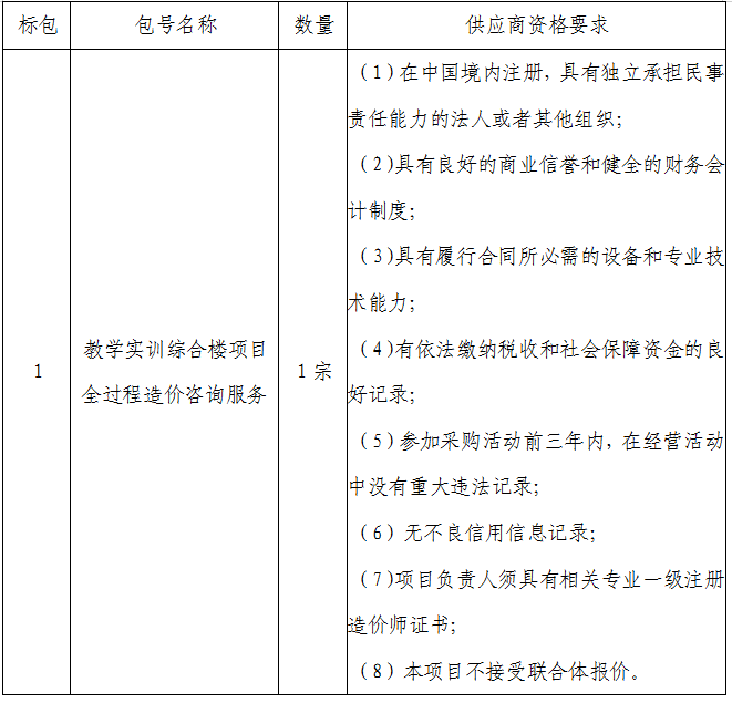 二、采购项目名称:教学实训综合楼项目全过程造价咨询服务