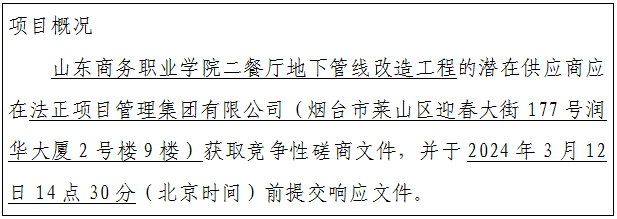 采购需求:本项目为山东商务职业学院二餐厅地下管线改造工程,位于山东省烟台市高新区山东商务职业学院,共分为一个包,采购预算为218113.65元,具体详见施工现场情况、工程量清单等。