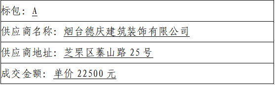 标包A:烟台德庆建筑装饰有限公司(83.67、86.67、87.67)、山东苑丰建筑装饰有限公司(67.9、74.9、78.9)、山东华安方圆建筑设计有限公司(76.0、86.0、86.0)、烟台市装饰设计院有限责任公司(78.0、87.0、87.0)、山东盛汇然建筑工程有限公司(79.37、84.37、85.37)