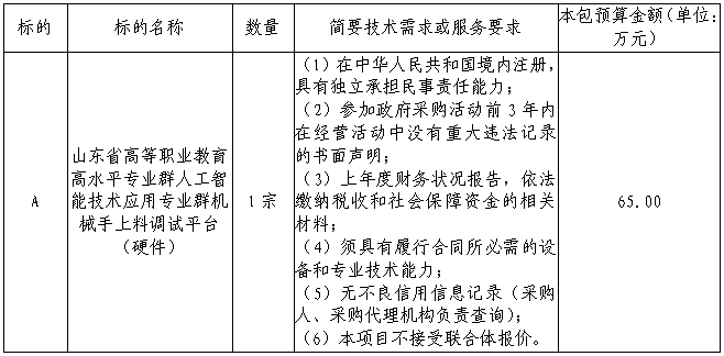 山东省高等职业教育高水平专业群人工智能技术应用专业群机械手上料调试平台(硬件)采购项目的潜在供应商应在山东云尚建设项目管理有限公司(烟台市高新区科技大道69号创业大厦西塔裙楼410)获取采购文件,并于2024-09-30 14:00:00(北京时间)前提交响应文件。
