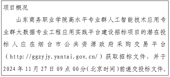 采购需求:本项目为山东商务职业学院高水平专业群人工智能技术应用专业群大数据专业工程应用实践平台建设,数量1宗。采购内容包括平台的安装调试、验收、培训、交付使用、质保及售后服务等。共划分为一个包,具体要求详见公开招标文件及附件。