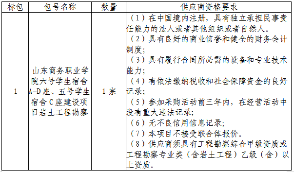 二、采购项目名称:山东商务职业学院山东商务职业学院六号学生宿舍A-D座、五号学生宿舍C座建设项目岩土工程勘察