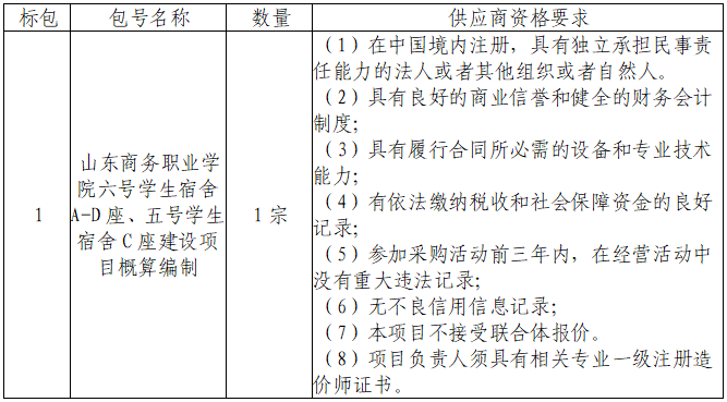 二、采购项目名称:山东商务职业学院山东商务职业学院六号学生宿舍A-D座、五号学生宿舍C座建设项目概算编制