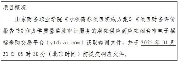 采购需求:本项目为山东商务职业学院《专项债券项目实施方案》、《项目财务评价报告书》和办学质量监测审计服务,对教学实训综合楼、两个产教融合中心等2个项目第二次申请专项债和新建宿舍楼项目第一次申请专项债所需的《专项债券项目实施方案》、《项目财务评价报告书》进行编制。对2025年办学质量监测所需的社会服务收入、高贡献高收入工资比例等2个项目审计报告进行编制。共分为1个采购包,具体采购需求详见竞争性磋商文件。