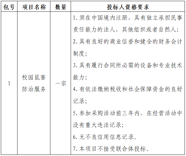 采购内容:校园鼠害防治服务;本项目划分一个包;