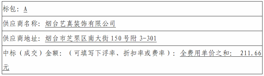 标包A:烟台艺真装饰有限公司(90.5、92.5、97.0)、烟台市飞和建筑工程有限公司(81.24、82.74、83.24)、山东亨谷建设工程有限公司(82.17、83.17、85.67)