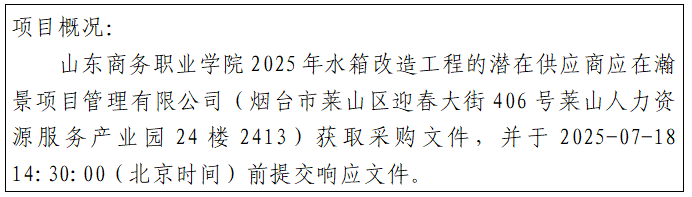 3.方式:根据山东省政府采购有关规定,凡有意参加本次政府采购的供应商必须在2025年7月14日17:30(北京时间)前访问“中国山东政府采购网(山东省政府采购信息公开平台)http://www.ccgp-shandong.gov.cn”进行注册并报名。注册并报名成功后,按照以下方式获取磋商文件:须将营业执照副本扫描件、所报项目名称、项目编号、项目联系人姓名、联系方式、汇款凭证电子版发至yantaihanjing123@163.com邮箱中。