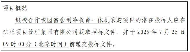 采购需求:本项目为银校合作校园宿舍制冷收费一体机,采购预算为1100万元,共划分为1个包。主要为学生宿舍安装制冷收费一体机及收费系统,并配备设备满负荷运转所需的室内室外电力电缆等保障设施。