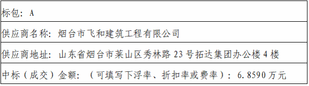 标包A:烟台市飞和建筑工程有限公司(76.5、86.0、88.0)、山东亨谷建设工程有限公司(77.24、79.24、83.24)、烟台市顺盛建筑安装有限责任公司(73.32、79.32、84.82)