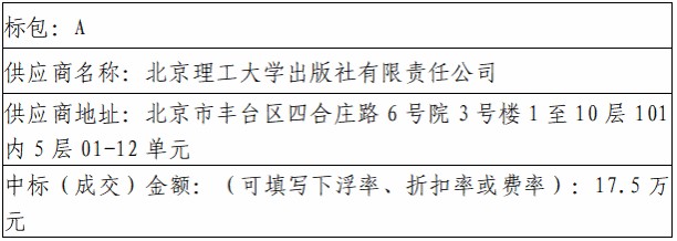 标包A:北京理工大学出版社有限责任公司(100.00、94.50、95.50)、山东托伟文化传媒有限公司(78.78、77.28、78.78)、国教广通(北京)教育科技研究院(74.83、77.83、79.33)