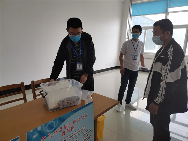 王海涛给大家详细讲解了上课前的体温检测、座位间距、开窗通风等注意事项,着重强调了学生体温如出现异常情况时,启动应急处置预案的流程和心理调适等问题。随后,王海涛在系图书馆临时留观室(T304)详细介绍了应急防护物品使用的注意事项,要求参与应急处理的辅导员,接到应急电话后立即穿上防护服,身着防护服赶到临时留观室后按照预案流程全程做好安全防护工作。同时要求学生牢记校内应急值班电话(0535-6925120),如有紧急情况,沉着冷静,不要慌张,立即拨打校内应急值班电话。全体师生认真听、用心记,时刻紧绷“安全防疫这根弦”,牢记“身心健康殷切嘱托”。
