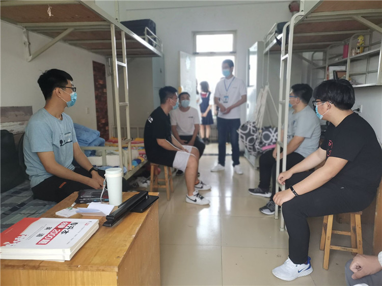 宿舍楼演练。教学楼演练活动结束后,全体师生又奔赴2A宿舍楼继续进行宿舍疫情防控应急演练。辅导员巩斌在610宿舍给全体学生耐心讲解住宿安全防护相关知识,提醒学生思想上一定高度重视,不要麻痹大意,嘱咐学生少凑人堆,不网购,勤通风,勤洗手,如遇到身体不适或体温异常情况,一定第一时间拨打校内应急值班电话,同时要联系班主任老师和辅导员,及时告知相关情况,配合后续工作。之后,辅导员又组织学生去616临时留观区,让学生明确留观注意事项。