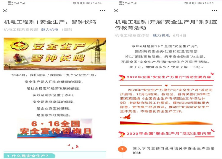 双线齐动员,营造良好氛围。运用“线上线下”两种手段开展宣传教育,充分利用主题班会形式、校园宣传栏、校园网、微信微博、悬挂横幅、发放宣传资料、现场咨询等线上和线下等宣传平台,加强关于安全生产的重要论述、安全生产月活动主题、机床设备事故警示教育片的学习宣传力度,积极营造浓厚的安全生产宣传氛围,进一步提高全员安全意识,筑牢“三基”工作,大力营造“以人为本,安全发展”的活动氛围。