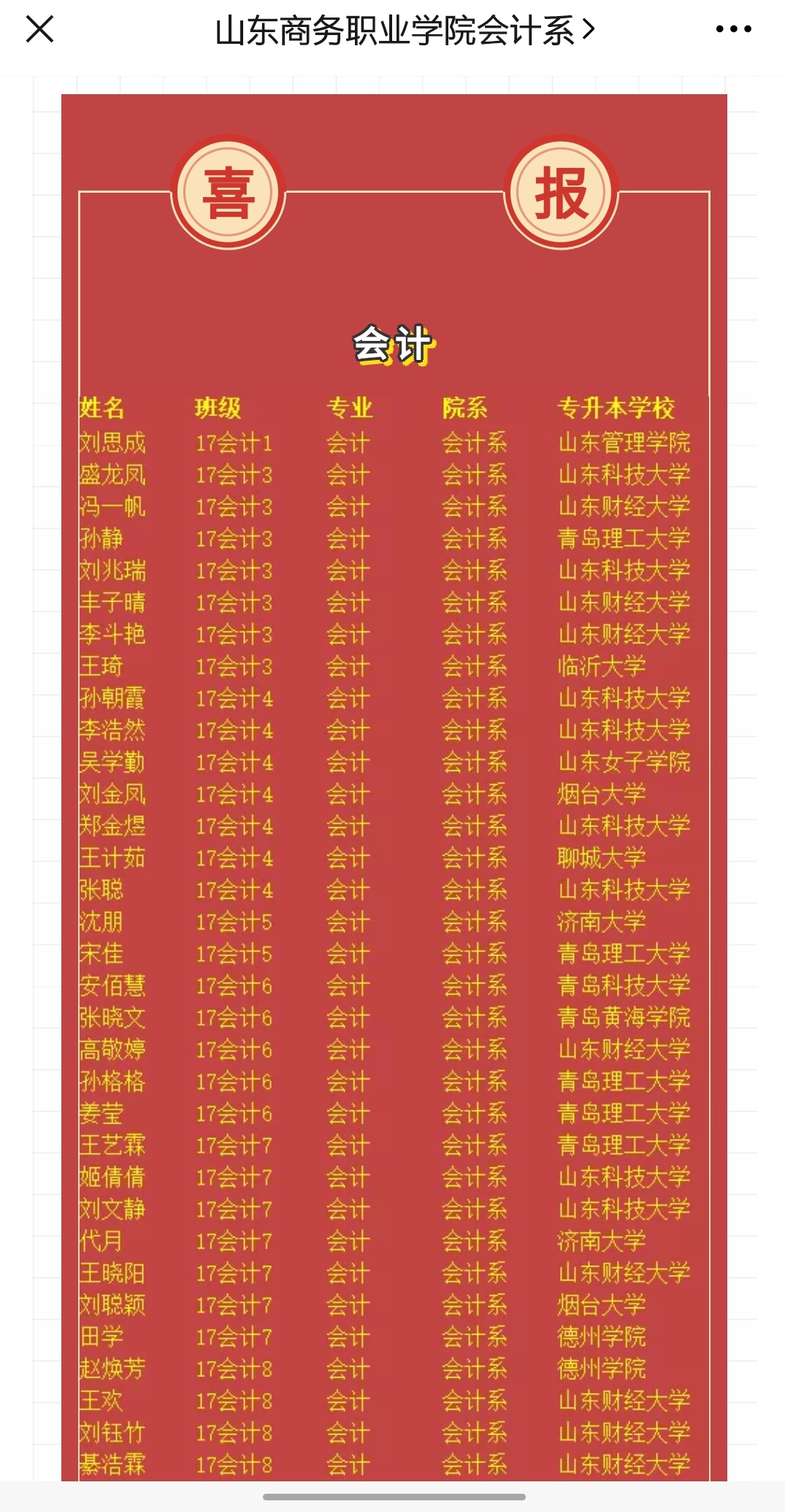 本站讯 近日,山东省2020专升本录取结果正式公布,会计系17级专升本168名同学,成功被青岛科技大学、临沂大学、山东交通学院、齐鲁师范学院等高校录取,录取率高达68%!