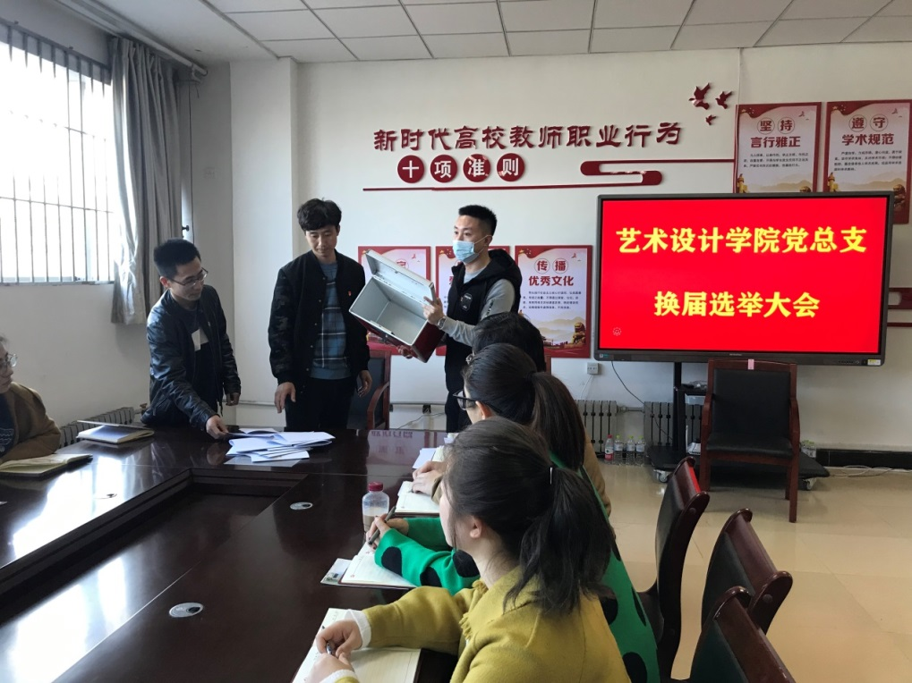 选举会议进行了三项议程:审议通过选举办法;通过监票人、计票人名单;选举新一届党总支部委员会委员。参会党员以举手表决的方式通过了《艺术设计学院党总支部委员选举办法》,同意监票人、计票人提名名单。在监票人的监督下,依据选举办法,参会党员以无记名投票的方式,选举产生了第一届党总支部委员会委员。经过与会党员的共同努力,圆满完成了会议各项议程。在雄壮的《国际歌》声中,艺术设计学院党总支党员选举大会顺利闭幕。随后,新当选的五位委员召开第一届党总支第一次会议,选举产生了党总支部书记和副书记,并进行了委员分工。各位委员满怀信心,共同表示不忘初心,牢记使命,带领全体师生开启“十四五”规划新征程,为建设高水平艺术设计学院而努力。