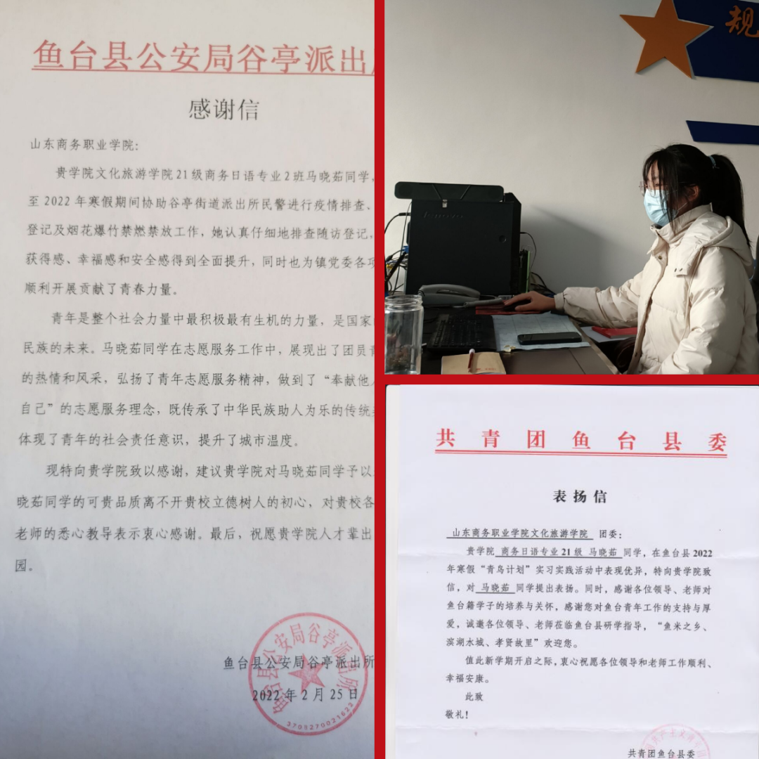21级应用韩语2班的戴梦萍同学报名参加了镇上的防疫工作,并获得了“优秀志愿者”称号,她在实践感言中写道:“在疫情中,无数逆行者在负重前行,我深受感动。作为一名大学生,我毅然加入了家乡的志愿者队伍,承担起青年的责任……”20级学前教育4班的韩盼盼同学积极响应号召,投身志愿服务一线,获得了乡人民政府授予的“最美志愿者”称号,她说:“第一次成为志愿者,我感受到了实现自我价值的成就感,也体会到了奉献的快乐,这是一次宝贵的经历,是我这个假期的最大收获。”21级商务日语1班的王冉同学参与了社区疫情防控、知识宣传等志愿工作,她说“通过志愿服务,我学到了很多课堂上学不到的知识,不仅锻炼了能力,也懂得了吃苦和坚持,学会了理解和感恩,我还会继续积极参加志愿活动,为社会做一些力所能及的事情。”