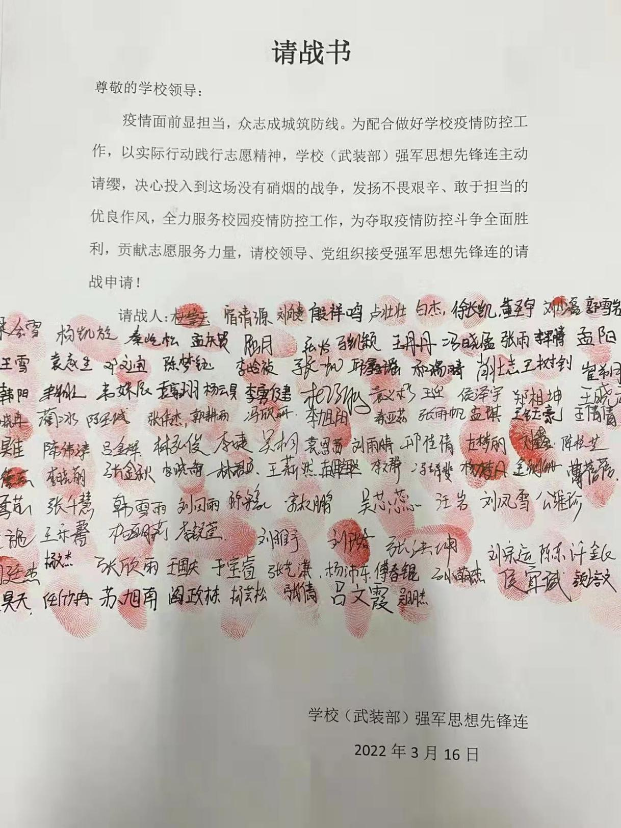 为保障疫情防控志愿服务工作顺利进行,学校武装部组织开展了“亮身份、当先锋,抗疫情、我先行”为主题的动员和志愿服务培训会,大家共同学习了学校疫情防控文件,组建了疫情防控应急冲锋队和志愿服务队。会上,每名先锋连成员签名了“请战书”并转发了“致家长一封信”。会后,同心抗疫的呼声,在先锋连里引起强烈反响,立刻行动、明确分工、各司其职,决心尽最多最大努力干好每一项工作任务,保证每一项工作衔接顺畅、高效有序。