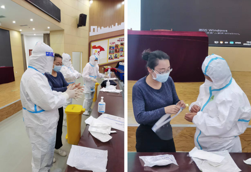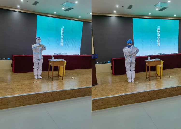 最后,全体参训人员分组开展实操演练,严格按照操作流程,确保熟练掌握穿脱防护服流程并规范使用相关防护用品。