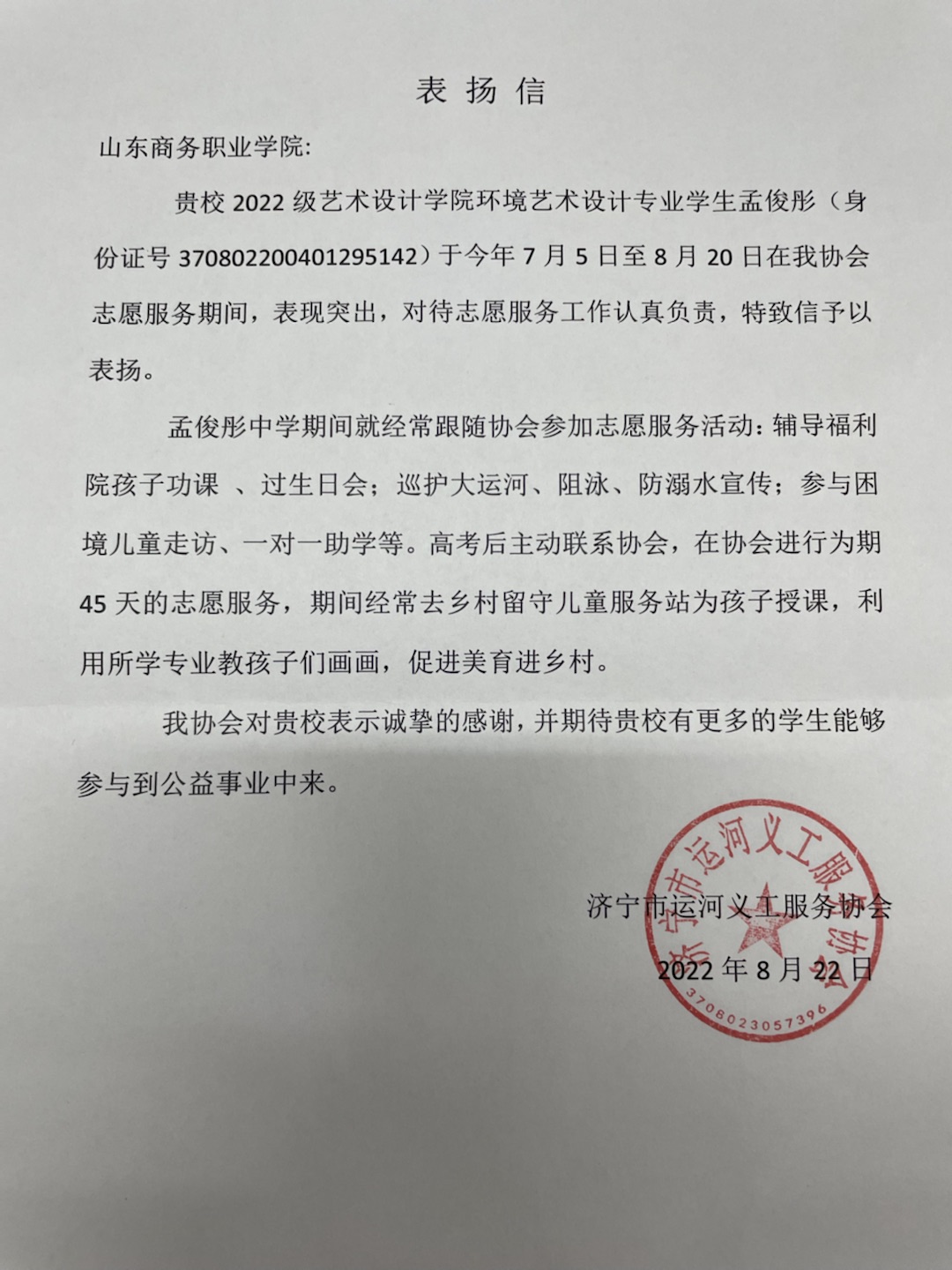 本站讯 近日,艺术设计学院收到来自中共曹县县委、曹县人民政府,菏泽市牡丹区西城街道办事处,济宁市运河义工服务协会的感谢信及荣誉证书,对学院2022级新生罗彦庆、张淼、孟俊彤假期积极参与疫情防控、阻泳防溺水、留守儿童陪伴等志愿服务活动表示感谢和表彰。