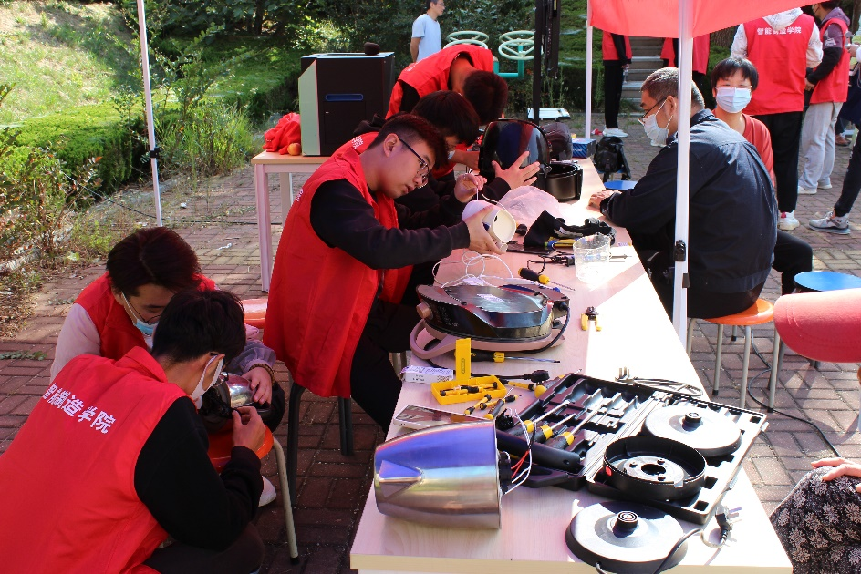 活动现场,学院学习协会的同学不仅耐心解答居民咨询的问题,还向居民宣传家电使用方法及保养常识。活动中,居民带来了家中有故障的电吹风、电饭锅、扫地机器人等小家电,学习协会的同学们各显其能,为居民们一一耐心查看电器故障并进行维修,得到居民的一致称赞。