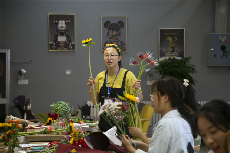 活动中,图书馆为同学们精心准备了红弗朗、康乃馨、玫瑰、小雏菊、向日葵等具有美好寓意的各式鲜花,花材艳丽多彩、缤纷多姿,象征着祖国繁荣昌盛。花艺老师向同学们讲解了不同鲜花的花语、插花艺术的颜色搭配及基本的插花手法及技巧等,并演示了插花制作过程。同学们紧跟老师的讲解,聚精会神地摆弄着手中一根根“美丽”又有点“倔强”的花材,许多同学直呼被这看似简单的插花“打败了”,纷纷向花艺老师求助。花艺老师不厌其烦地为同学们讲解、演示,同学们在这些小花面前也毫不示弱,经过一番指导,同学们学会了构思、选花、修剪、整枝,将原本零散的花材,修整得错落有致,变成了一件件独具匠心又饱含深意的花艺作品。整个活动现场花香四溢,欢声笑语不断。