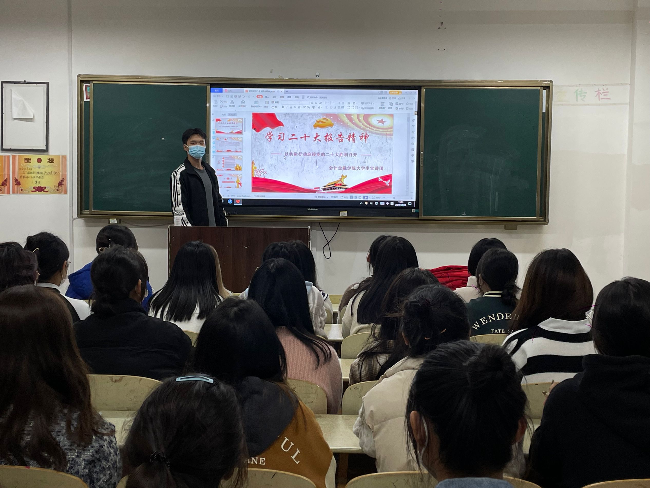 本站讯 为深入学习党的二十大精神,推动青年大学生努力成长为有理想、敢担当、能吃苦、肯奋斗的新时代青年,近日,会计金融学院大学生宣讲团走进教室,与同学们共同学习党的二十大精神,交流心得体会。