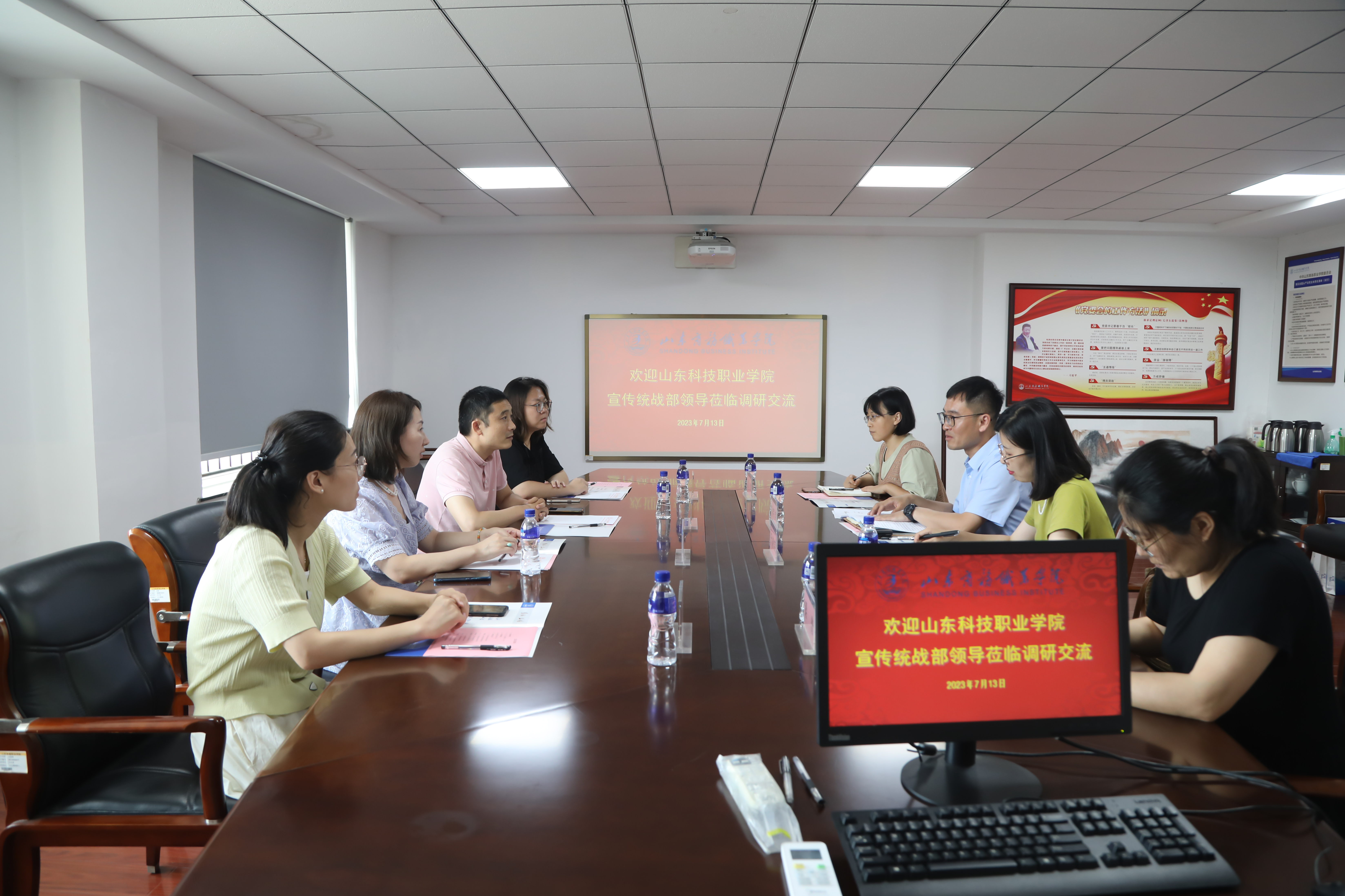 本站讯 7月13日下午,山东科技职业学院宣传统战部副部长李晨歌、副部长李冰等一行4人来我校调研交流。学校宣传统战部部长孙芹宝主持座谈。