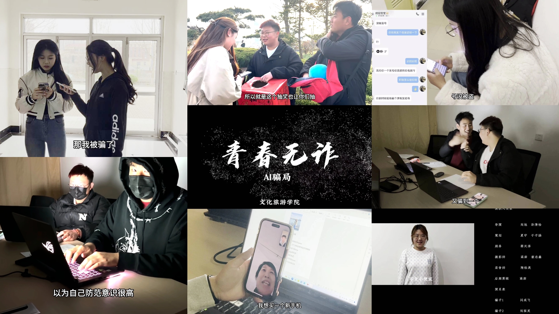 以案释法,拍摄“青春无诈”系列防诈反诈宣传视频。4月12日上午,学院组织学生自编自导自演了“青春无诈”系列防诈反诈宣传视频上线。第一部《AI骗局》讲述了诈骗分子利用大学生爱贪小便宜、爱薅羊毛的心理获取个人信息,用两个身边的案例展现了骗子如何使用AI换脸、声音合成冒充本人实施诈骗的过程。视频内容均来自真实案例,根据大学生的特点,用大学生容易接受的方式来传达防诈骗知识。22级旅游管理1班的刘旭同学说:“这个视频全部由我们学院的学生独立拍摄制作完成。希望借由此视频,大家多多关注反诈知识,不仅要了解最新的诈骗手段,还要时刻保持警惕,预防新型诈骗。”