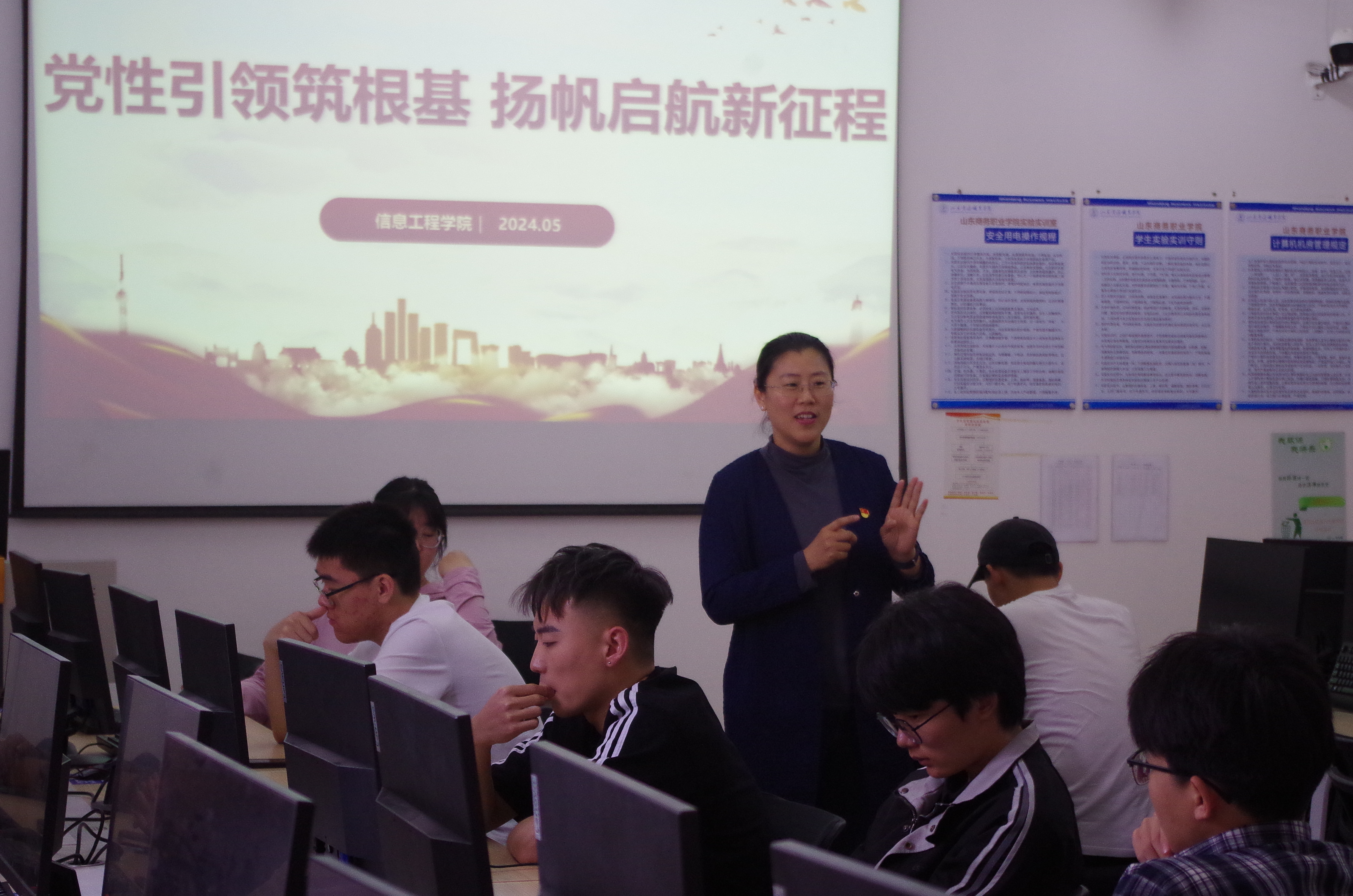 本站讯 为切实加强学生的思想政治教育,引导广大青年学生提高思想认识、坚定理想信念。5月14日下午,信息工程学院院长高晓燕在实训楼E区203教室讲授“党性引领筑根基,扬帆启航新征程”专题思政课,学院优秀学生代表参加了学习。